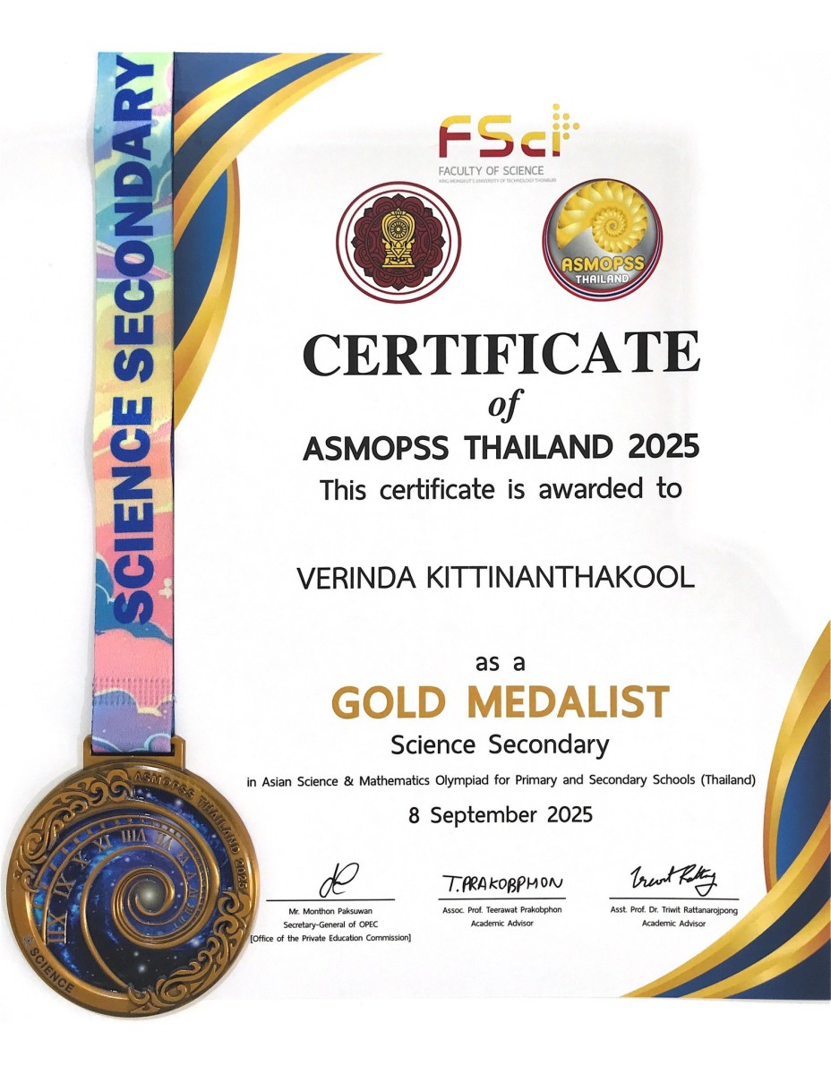 Congratulations to Miss Verinda Kittinanthakool, M.1/353 for her outstanding achievement in the “ASMOPSS 2025: Academic Excellence Measurement Competition in Science, Mathematics, and English: National Excellence Round” held on September 8, 2025.