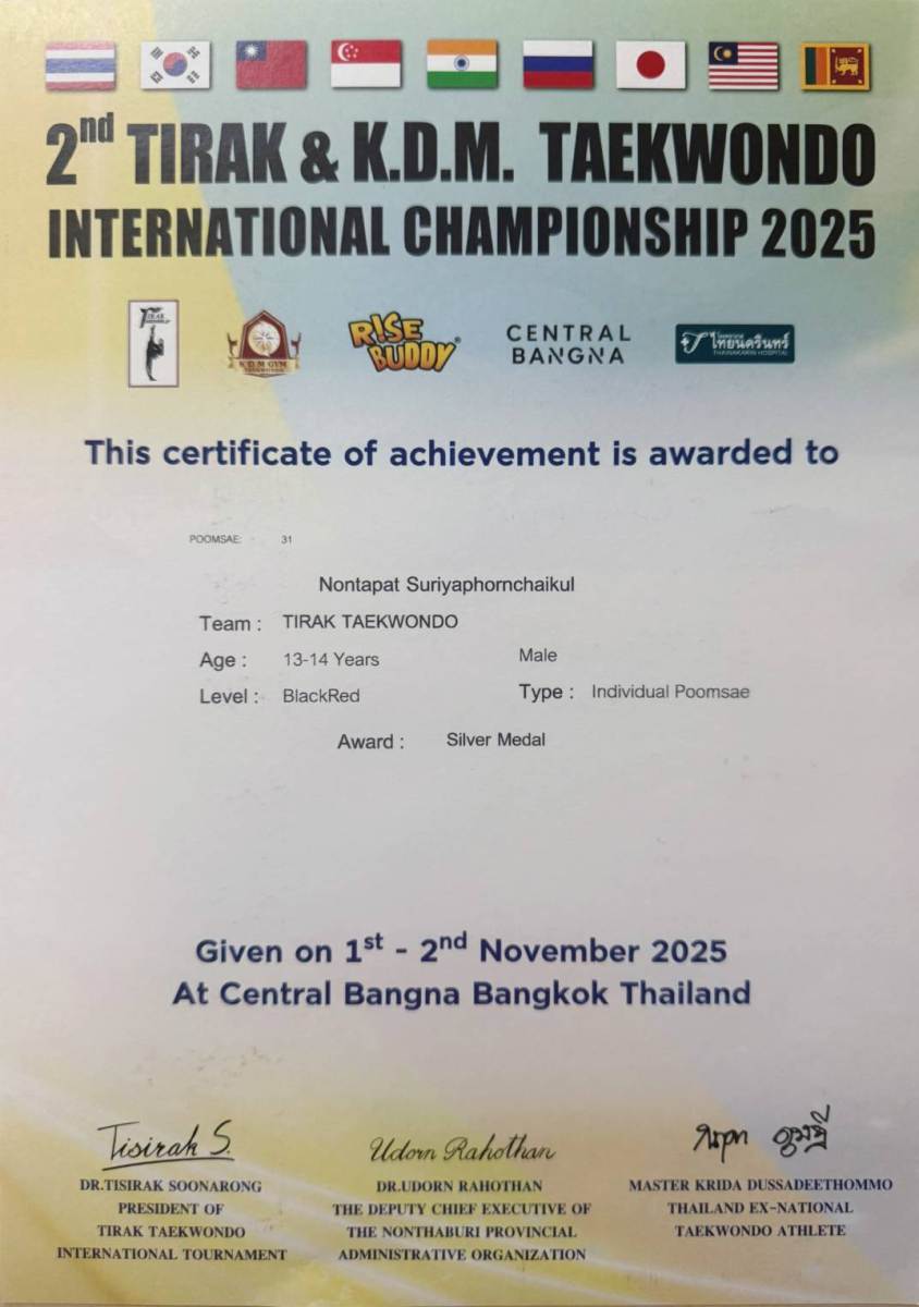 Congratulations to Mr.Nontapat Suriyaphornchaikul, M.1/343 for his achievements in the “2nd TIRAK & K.D.M. TAEKWONDO INTERNATIONAL CHAMPIONSHIP 2025,” held on November 1-2, 2025, at Central Bangna, Bangkok. His awards are as follows: