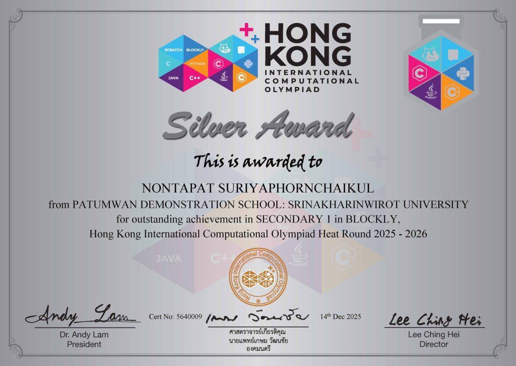 Congratulations to Mr.Nontapat Suriyaphornchaikul M.1/343 on receiving the Silver Award in the Blockly (Secondary 1) category. This honor was achieved at the Hong Kong International Computational Olympiad 2025-2026 (HKICO), held on December 14, 2025. The competition was organized by the Olympiad Champion Education Centre (OCEC).