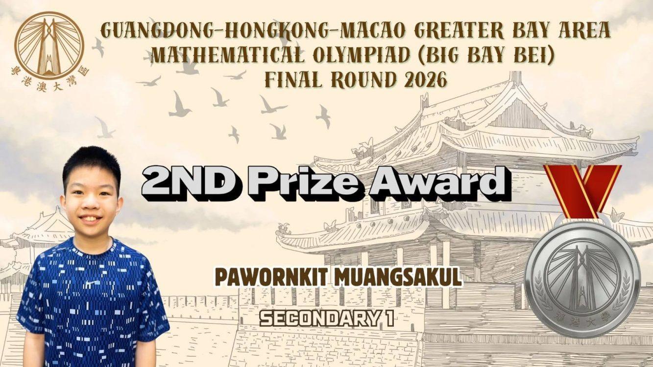 Congratulations to Mr.Pawornkit Muangsakul M.1/353 on winning the Silver Medal in the Secondary 1 category at the Guangdong-Hong Kong-Macao Greater Bay Area Mathematical Olympiad (BIG BAY BEI). The competition was organized by the Olympiad Champion Education Center (OCEC) and held from March 14–15, 2026, in the Hong Kong Special Administrative Region.